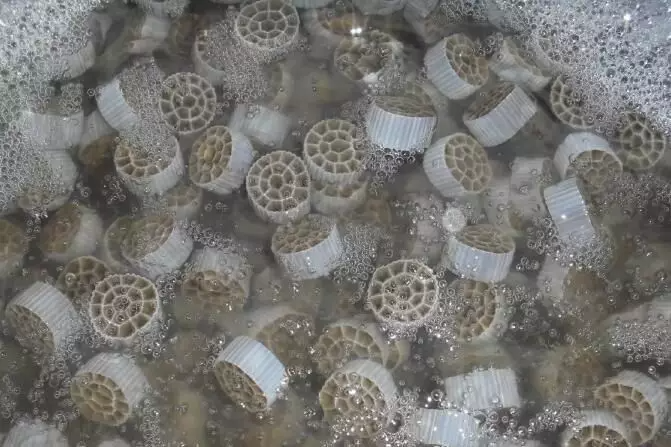微生物附着的移动床填料是规划的中心,填料功用的好坏直接影响生物膜的构成、生物量的多少以及处理功率。填充资料一般由内外两部分组成,由于外维护作用,微生物多粘附在内部,外受水流、气流和填充资料的冲击,微生物不易粘附,生物膜散布不均匀。为使填料能在反响器中构成杰出的流化作用,对密度的要求一般不超过1g/cm3。经过投加量控制生物膜比表面积,填料体积可高达反响器体积的70%,反响器内生物膜比表面积可到达400~500m2/m3,实践可用于微生物生长的最大比表面积为350m2/m3。