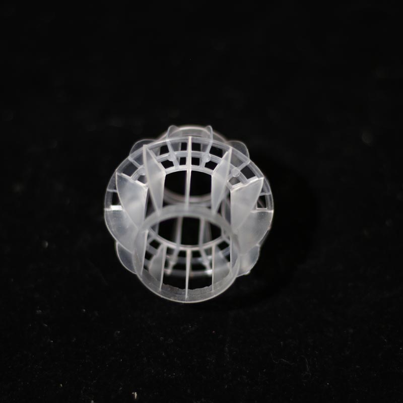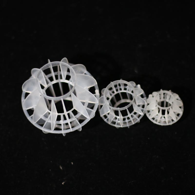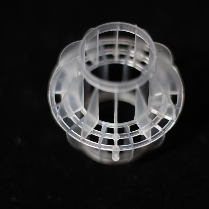 塑料多面体空心球是由两个半球组成的球体,每个半球由几个半扇形叶片组成,上下叶片交错排列。这种球的优点是容易在填料层完全堆积,但不会造成架桥和孔隙效应。